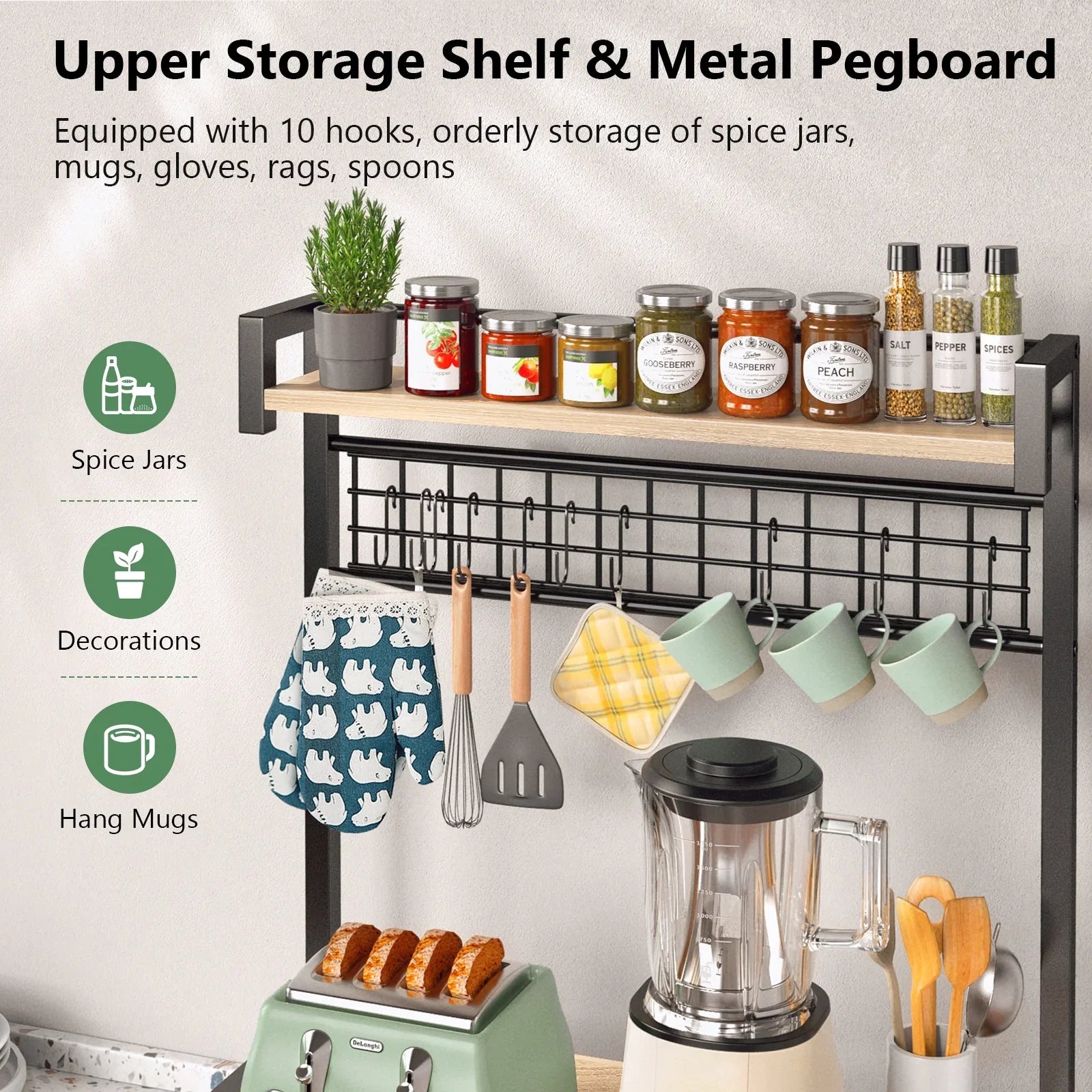 - 【Versatile Hanging Options】Equipped with 10 S-shaped hooks and metal pegboard, our kitchen storage shelf provides versatile hanging solutions. Hang cups, kitchen scissors, spatulas, spoons, and even pans at convenient heights, ensuring everything is within arm‘s reach for easy access during meal preparation.