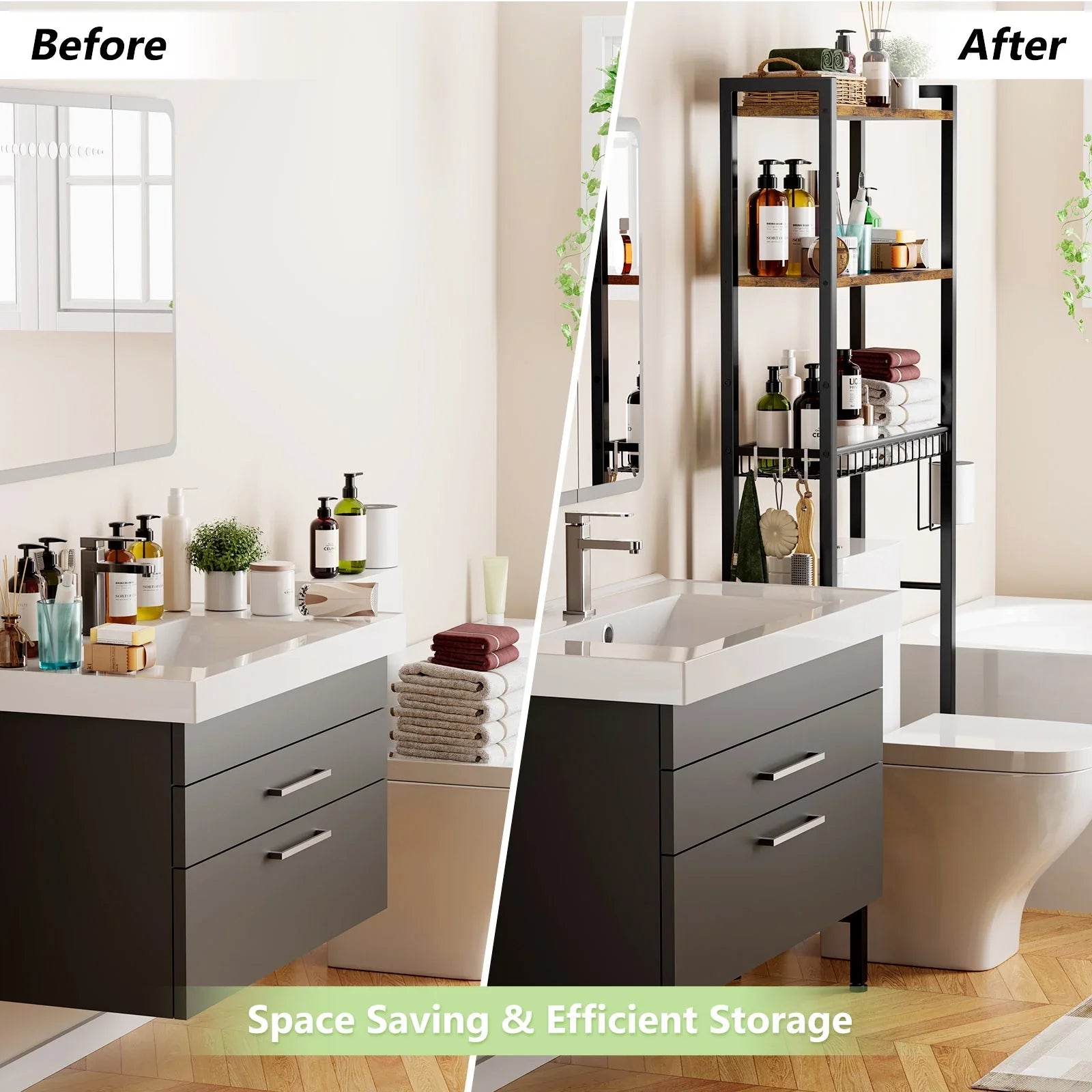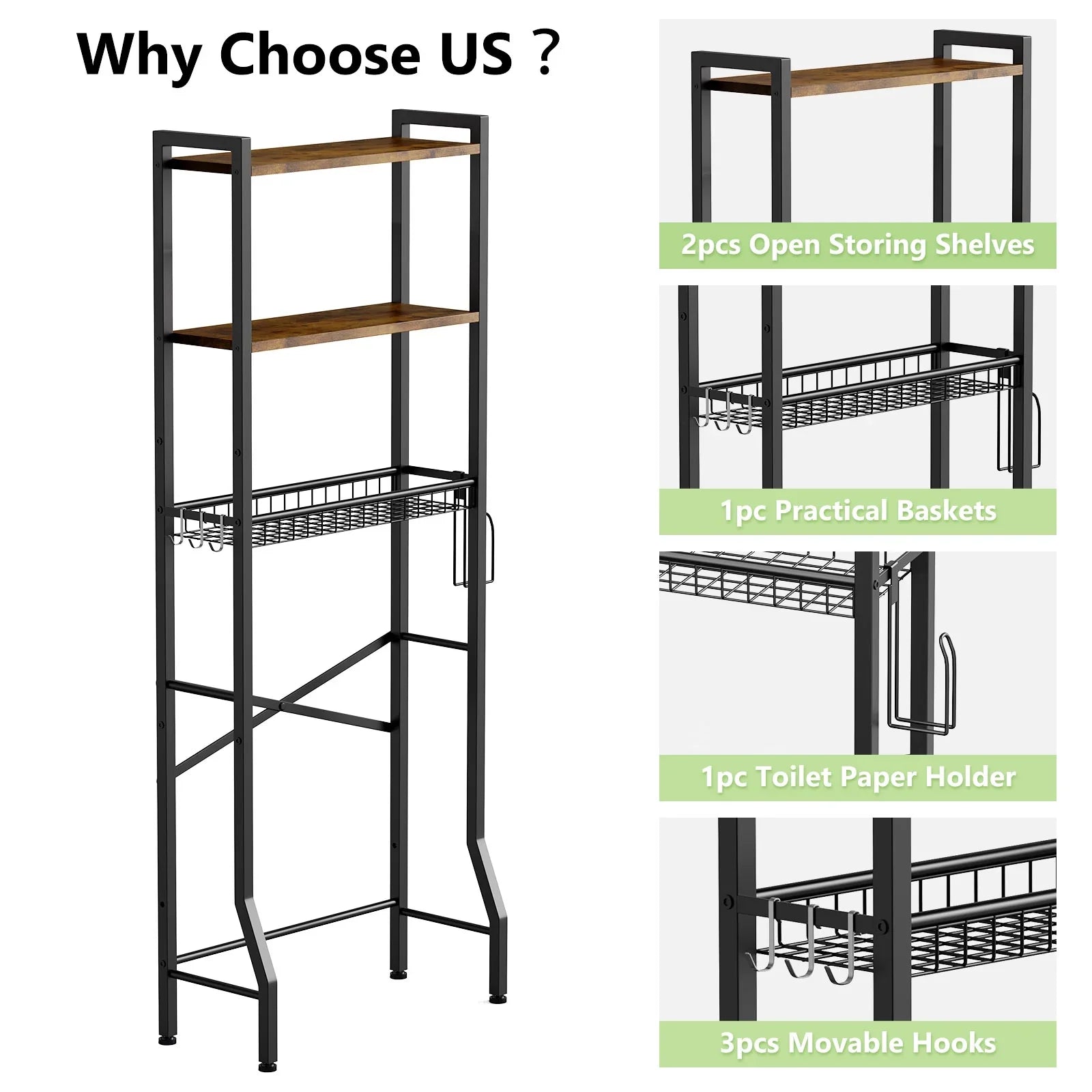 - [3-TIER BATHROOM ORGANIZER]: Providing plenty of space to store bath essentials with this Biemlerfn toilet rack that boasts 3 tiers of storage. With the added convenience of a built-in toilet paper holder and three detachable hooks, you can keep your bathroom tidy and organized. Size of the over the toilet storage rack is 23.62" L x 9.4" W x 63.39" H, suitable for most of toilets on the market.