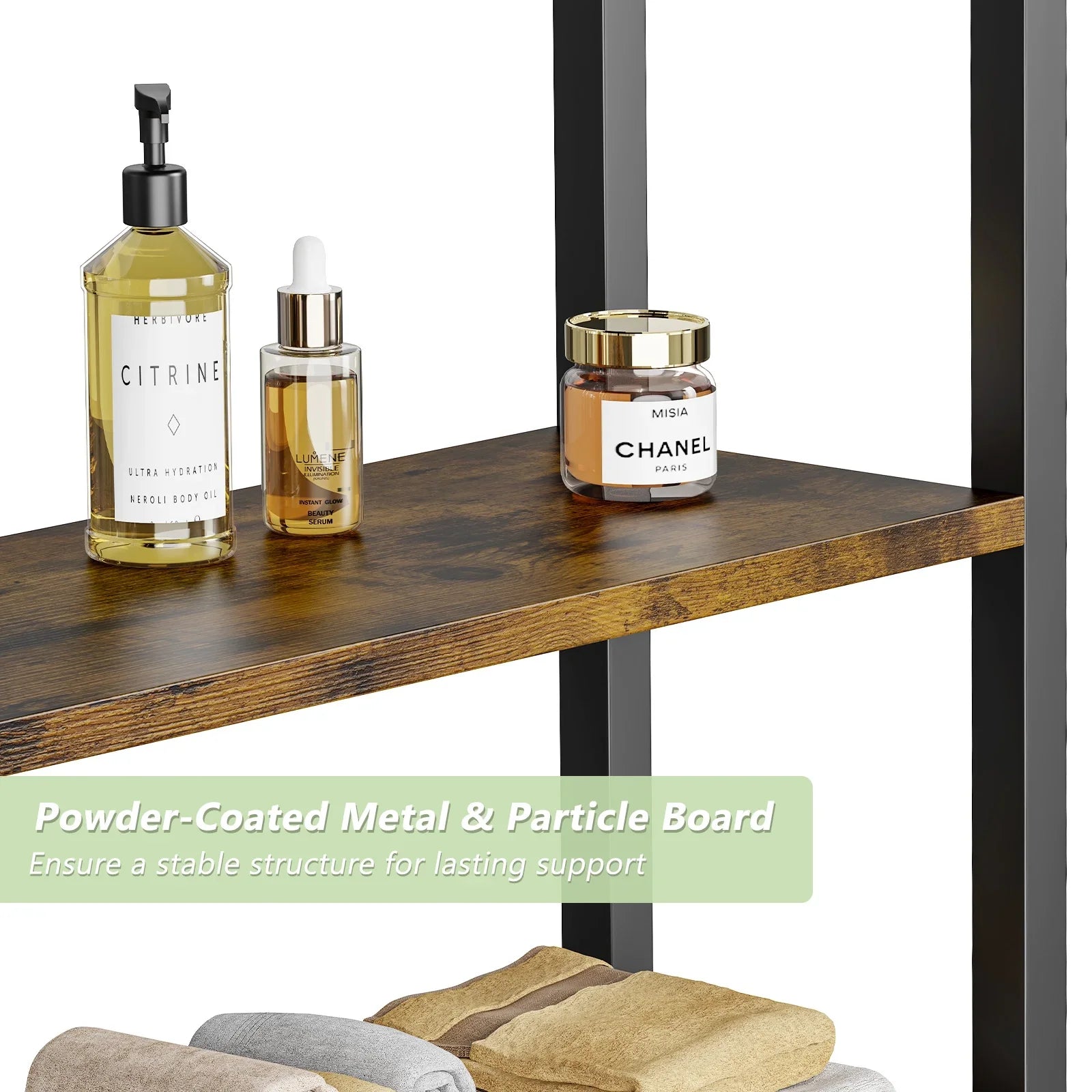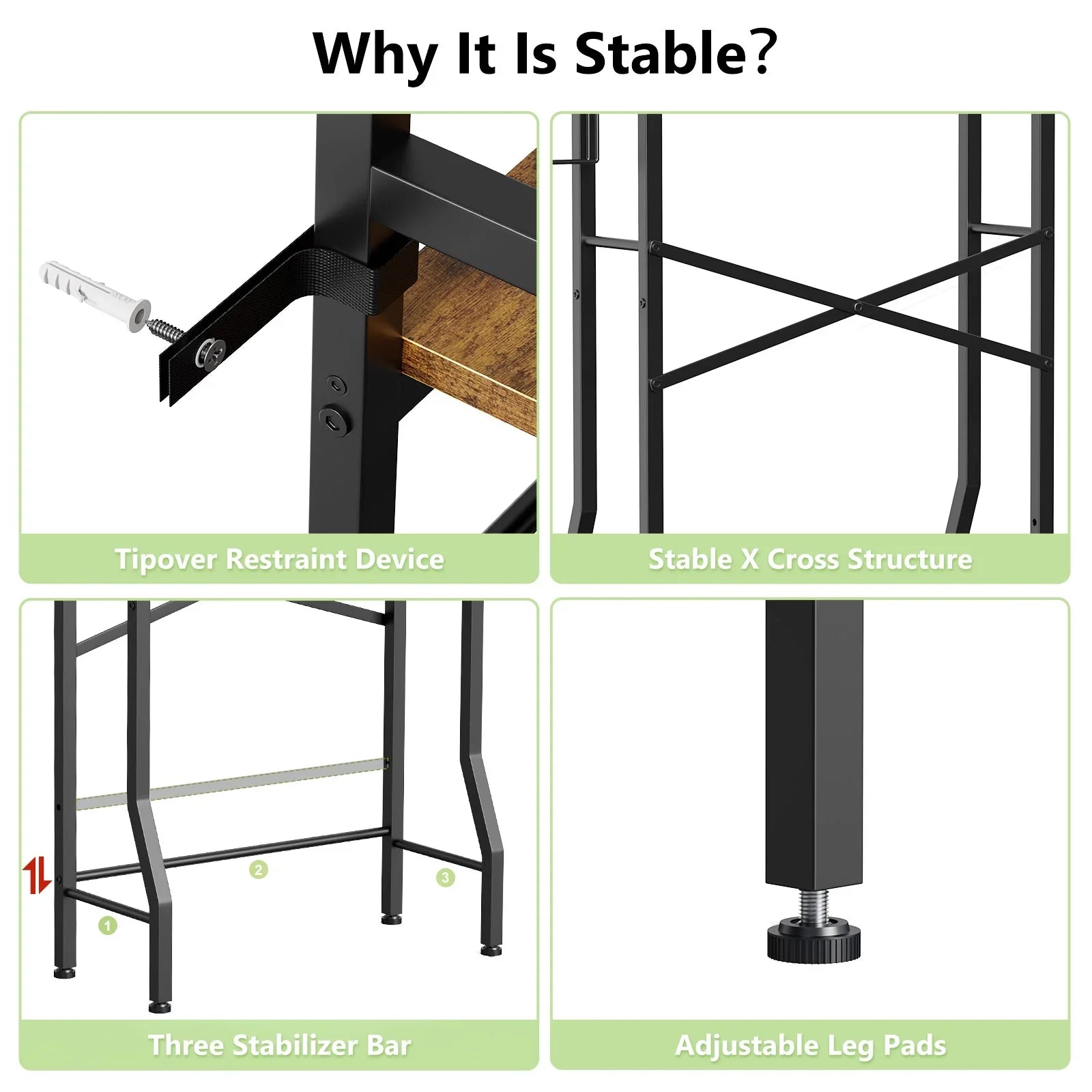 - [STABLE CONSTRUCTION]: The sturdy X-shaped metal bar on the back enhances the stability of the frame. An additional tipover restraint device prevents over the toilet shelf from wobbling, further increasing safety, making it a reliable storage solution for households with children and pets. Each wooden shelf load capacity(each tier): 33lb.