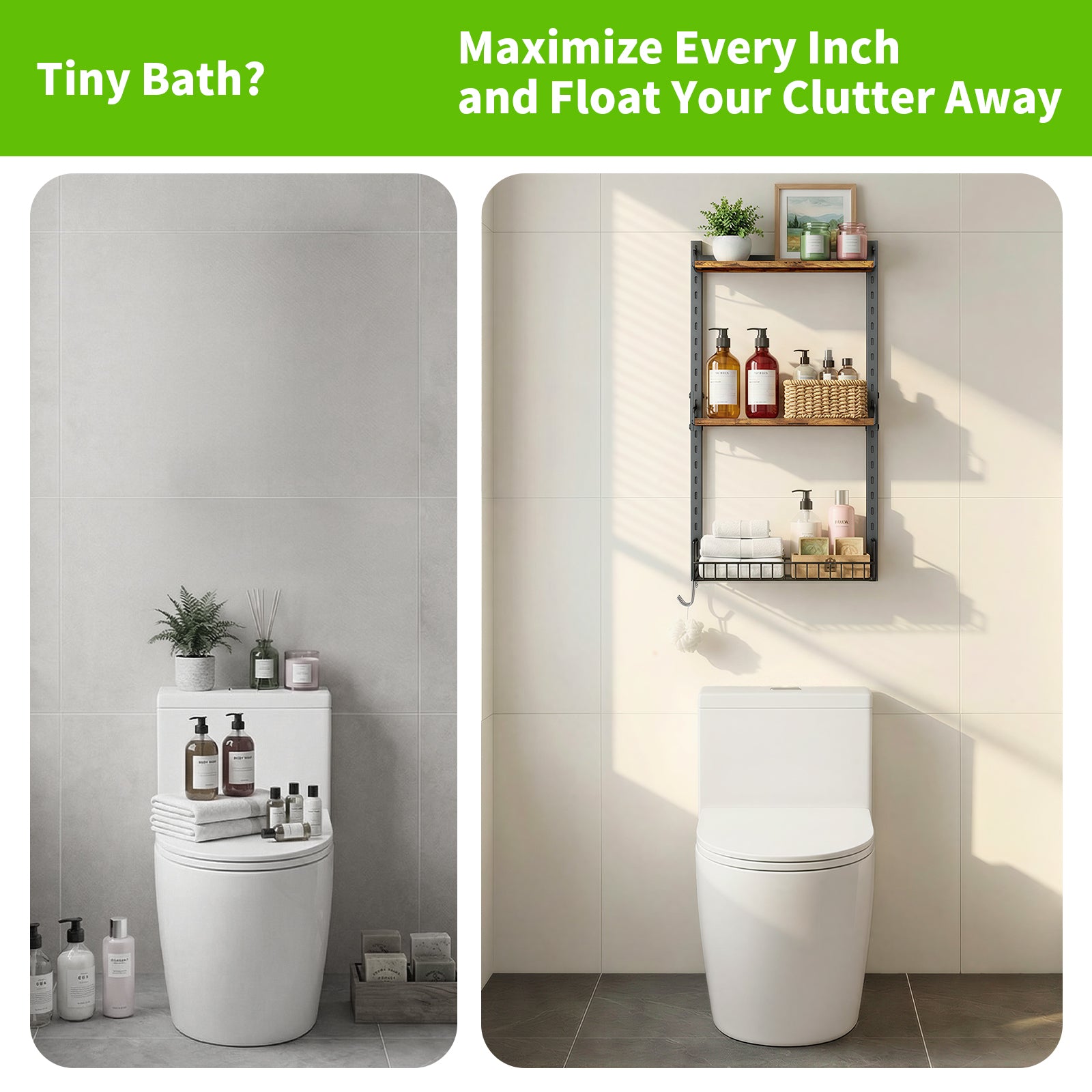 [Space-Saving Multi-Functional Design]: With its compact size of 16.77" x 7.67" x 30.59", this wall-mounted shelf is designed to maximize vertical space while keeping your home organized and clutter-free. Perfect as a bathroom over-toilet storage shelf, it also works beautifully as a kitchen spice rack, living room display shelf, bookshelf, or tool storage rack in a utility room. Versatile and practical, this shelf adapts effortlessly to your needs—discover even more ways to use it throughout your home!