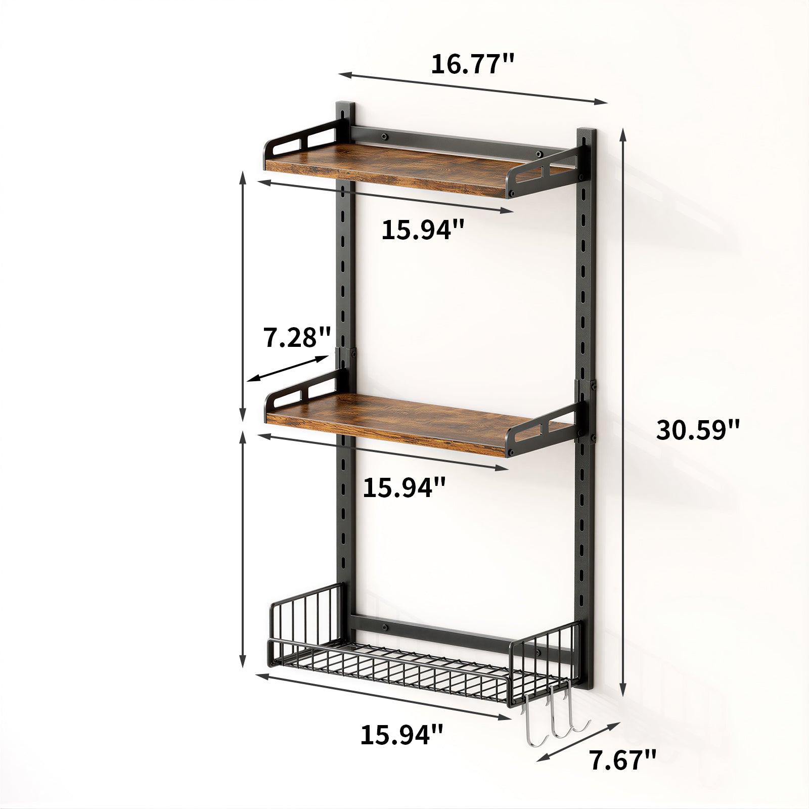 [Customizable Storage Solution]: Easily adjust the shelves and baskets along the two vertical metal tracks to suit your storage needs. Whether you're organizing toiletries, spices, books, or décor, this wall-mounted shelf provides a personalized and tidy storage solution. The side guardrails ensure everything stays securely in place, offering peace of mind while maximizing your space.